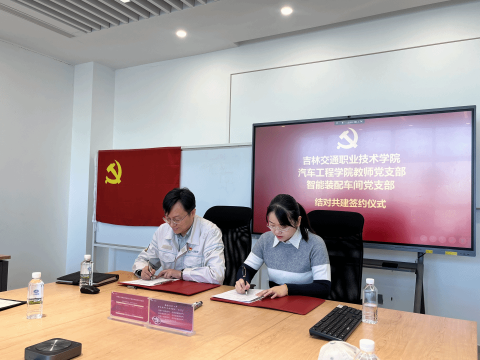为深化产教融合、以党建引领校企协同发展,12月22日,吉林交通职业技术学院汽车工程学院教师第一党支部与一汽解放卡车厂智能装配车间党支部在车间二楼会议室举行党建共建签约仪式,汽车工程学院党总支书记崔秀虹,院长张立华,副院长张井柱、蔚佳彤,智能装配车间党支部书记叶旭林、车间副主任马琳及双方支部党员代表出席仪式。